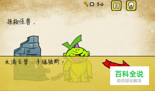因为怪兽是被铁链锁住的,所以我们只需要将铁链弄断就行了。我们用手指在铁链上来回摩擦,相当于是在割断铁链。摩擦一定时间后,铁链就会断掉,小怪兽就拯救成功啦!