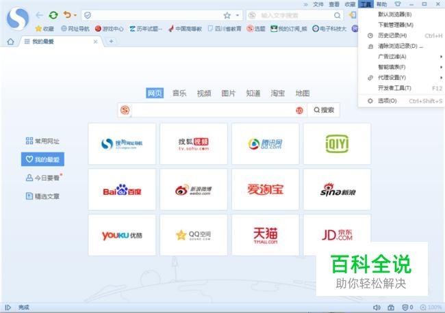 打开电脑中的搜狗浏览器,在上方选择“工具”