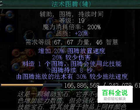 这种“图腾化”的辅助宝石跟相应的主动宝石相连,即可将主动宝石变为使用该技能后不是直接放出攻击或者法术了,而是放出个图腾,由此图腾来代替你自身去放这种攻击或者法术。