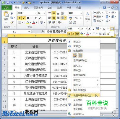 第1步,打开Excel2010工作簿窗口,选中需要设置加粗、倾斜和下划线的单元格。右键单击被选中的单元格,在打开的快捷菜单中选择“设置单元格格式”命令,如图2010080508所示。 图2010080508 选择“设置单元格格式”命令