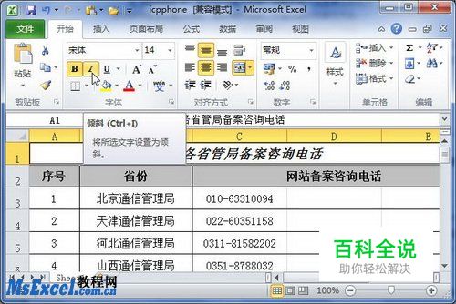在Excel2010中,用户可以在“开始”功能区或“设置单元格格式”对话框中将被选中单元格中的全部或部分字体设置为加粗、倾斜和下划线,下面分别介绍操作方法。