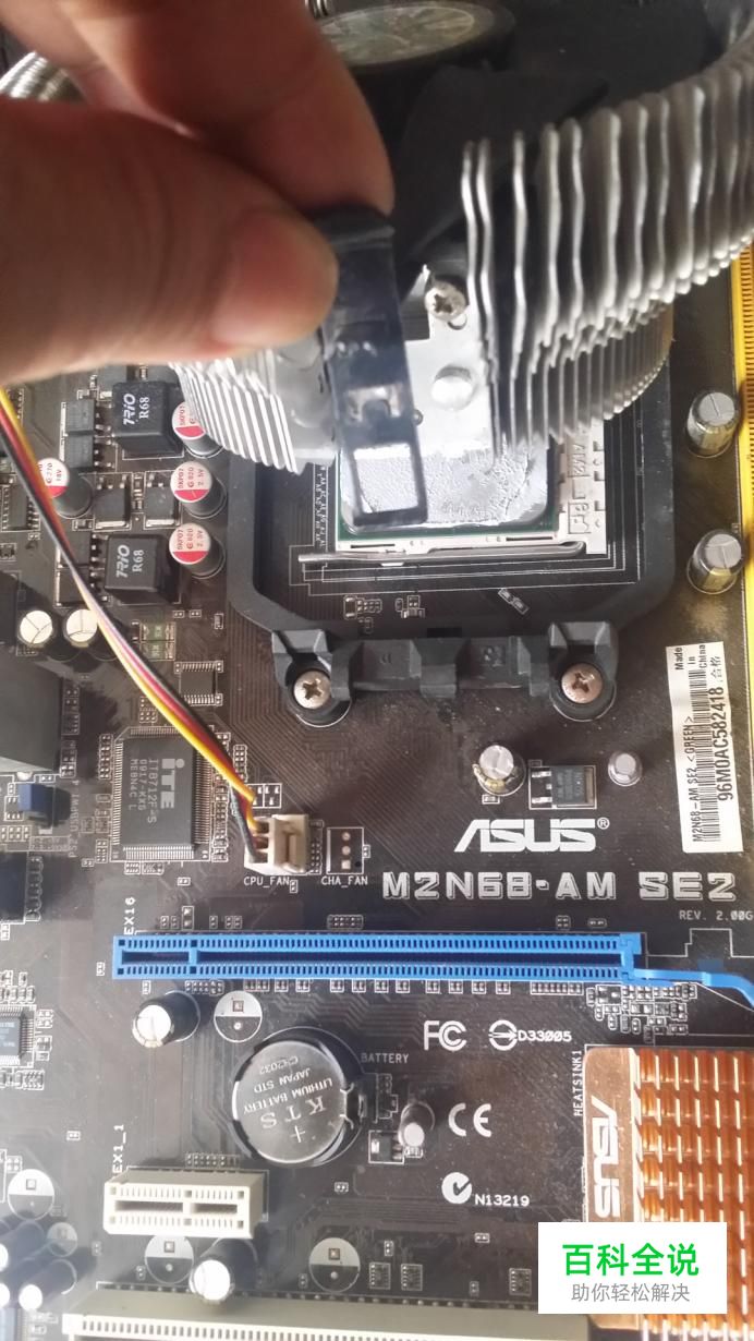 然后把散热器压在CPU上面,扣好扣具,别忘了插上风扇供电插头。