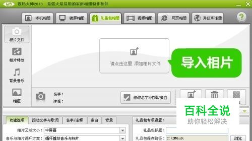 导入相片素材 在如下的“礼品包相册”主界面中部相片列表空白处双击鼠标左键,在弹出的对话框中通过Ctrl+A键,选中你的全部照片,一次性导入即可。