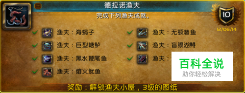 后续任务及奖励 成就全部都完成后,建造你的三级渔夫小屋,然后接任务!这家伙告诉你还要去钓一条鱼!部落去要塞旁边的岩浆池,联盟玩家请自行根据地图查找,估计也差不多!