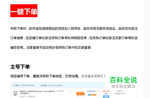 采购下单时,软件自动选择相应的属性加入购物车,自动填写买家收货地址,自动双向备注订单信息,在店铺订单处备注采购订单号和采购旺旺号,在采购订单处备注买家订单号和店铺旺旺号。买家留言可自动同步到采购订单中的买家留言