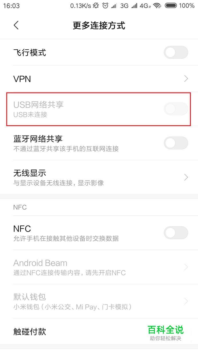 接下来,在更多连接方式页面中,就可以看到USB共享网络设置选项了,此时功能开关处于关闭状态。