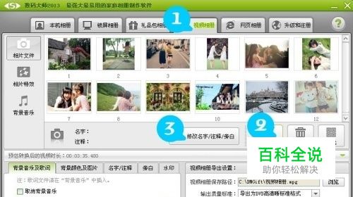相片导入并修改相片名字/注释/旁白 首先,我们可以先准备好制作翻书相册的素材:相片、音乐、歌词文件(从网上下载即可)。启动《数 码 大 师》后,我们点击下图标签1-“视频相册”选项卡后,点击标签2-“添加相片”按钮将自己喜欢的相片导入到软件里面。如果我们想将自己的心情写入到相册里面,可以通过标签3-“修改名字/注释/旁白”按钮进行添加~