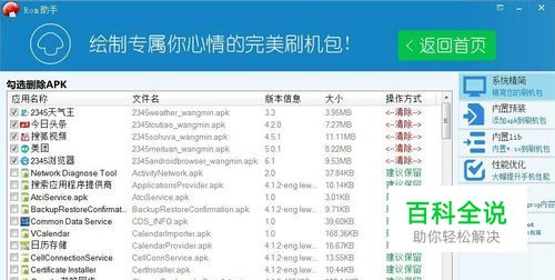 2:在此之前我们要先下载好适合自己机型的rom包,打开“系统精简”功能,选择下载的rom包,等待加载完成,rom助手就直观的显示原rom包里面的软件。可以清晰的看到哪些是预装软件,哪些是系统软件。这时,我们可以根据自己的需求,删除那些不需要的预装软件(勾选即可清理)。(如图)