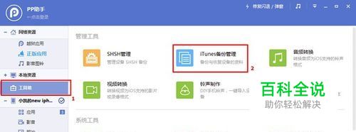 打开PP助手软件,点击“工具箱”,“iTunes备份管理”。