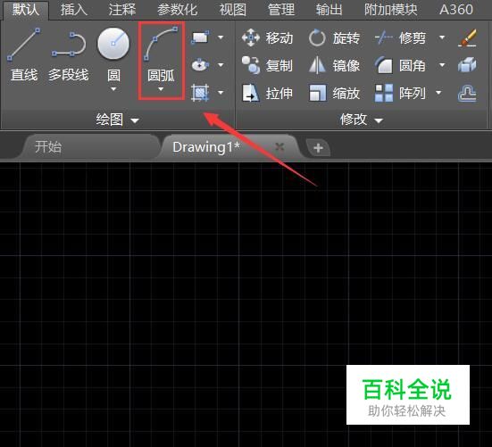 打开CAD之后在常用菜单里找到圆弧选项,如图所示: