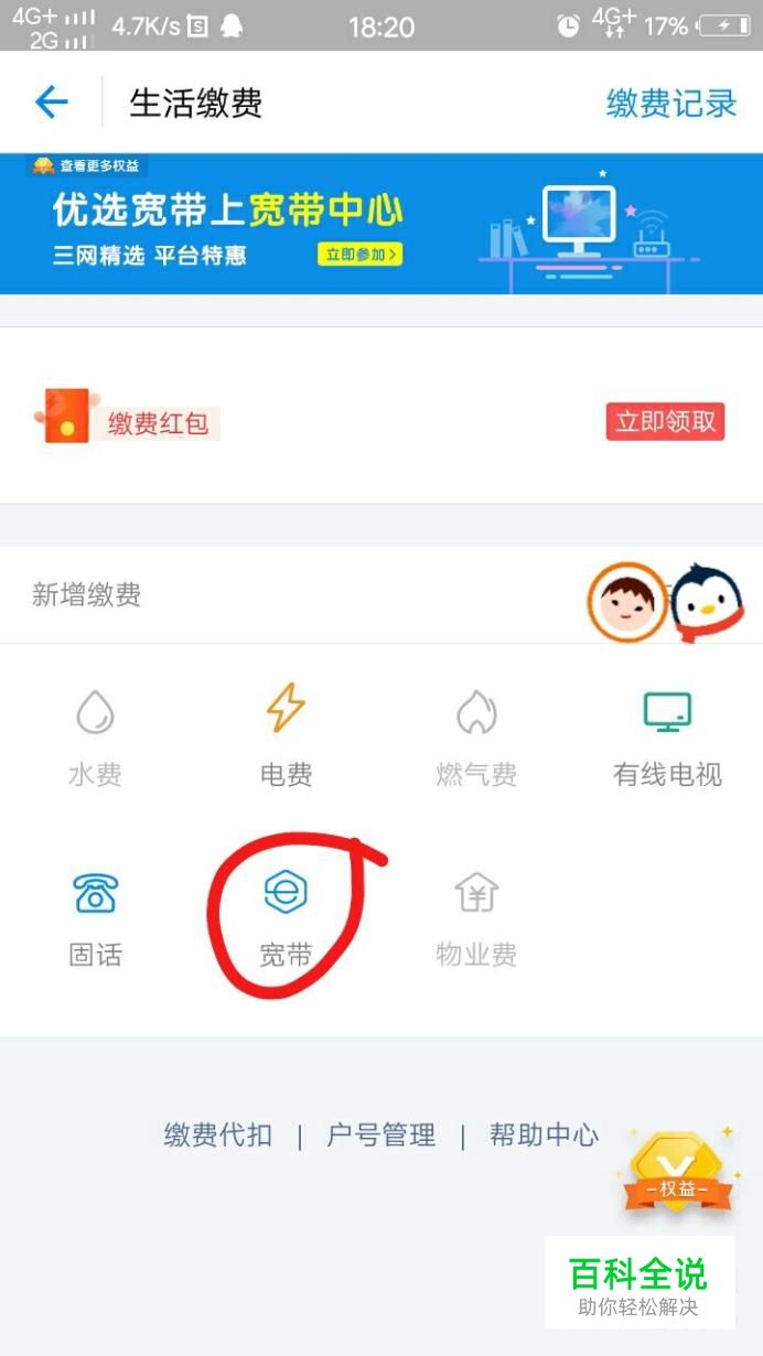 接着,这里面有很多种类的缴费,我们点击“宽带”。