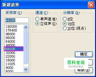 由上面一张图可以看到音频剪辑软件的操作界面还是很简洁的,那我们先新建一个会话,选择文件 — 新建,或者按快捷键Ctrl+N,弹出一个新建波形的对话框,音频的采样率选择44100KHz即可,这个是标准的,当然,如果你已经知道你用到的素材是其他采样率的,那么你也可以在新建的时候就选择相对应的采样率就好。通道选择立体声,分辨率选择16位,保持默认的就可以啦。
