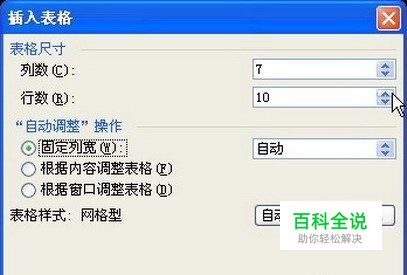 第1步,在Word2003文档窗口菜单栏依次选择“表格”→“插入”→“表格”菜单命令(或者单击“常用”工具栏上的“插入表格”按钮),打开“插入表格”对话框。在“表格尺寸”区域调整微调框,将“列数”设置为7、“行数”设置为10。最后单击“确定”按钮,如图2008071230所示。 图2008071230设置表格的列数和行数