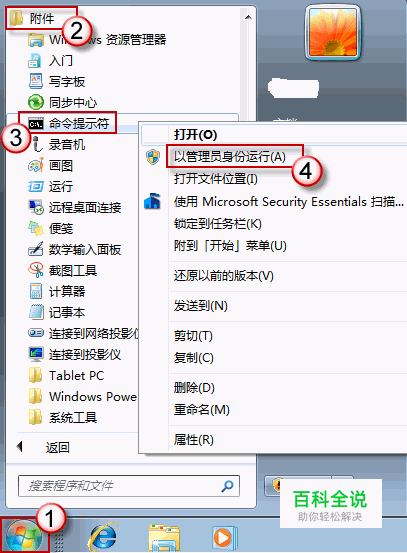 单击“开始”按钮,依次打开“所有程序>附件”。右键单击“命令提示符”,选择“以管理员身份运行”