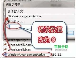 2、在注册表管理器中,首先需要找到“HKEY_CURRENT_USERControl PanelDesktop” 表项,在右侧窗口中找到并双击“WindowArrangementActive”,然后在弹出的对话框中,将系统默认的值“1”修改为“0”。然后注销计算机即可。