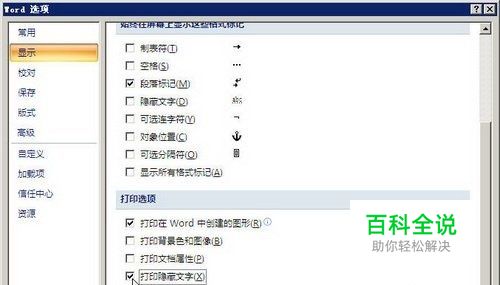 第2步,打开“Word选项”对话框,切换到“显示”选项卡。在“打印选项”区域选中“打印隐藏文字”复选框,并单击“确定”按钮,如图2012040208所示。 图2012040208 选中“打印隐藏文字”复选框