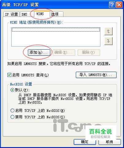 E:在“DNS”项中添加一个地址,在“WINS”项中添加一个地址