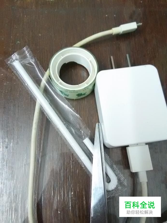 准备剪刀、吸管、胶带,以及数据线。吸管要和数据线差不多粗细。