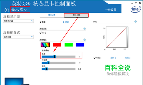 软件调节,也就是通过显卡控制面板来对亮度进行调节 如果电脑使用的Intel集成显卡或带有双显卡切换功能的笔记本电脑,可以在桌面空白处点击右键选择图形属性来打开Intel集显控制面板,在显示器中的颜色设置下找到亮度调节滑块进行亮度调节,默认亮度是0