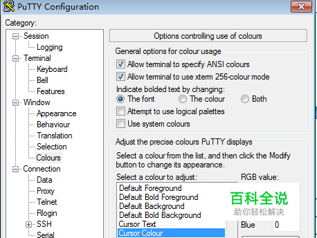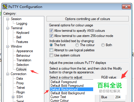 进入颜色设置 category->Window->Colours