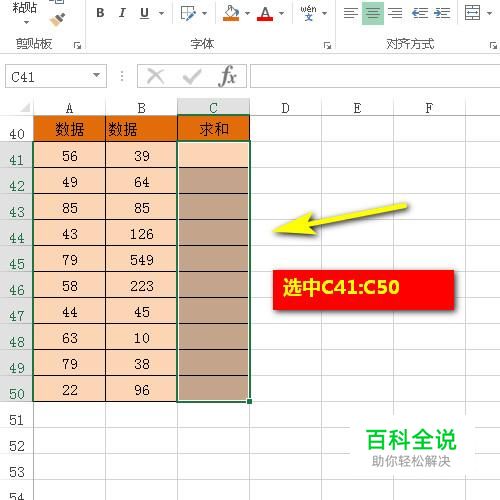 选中C41:C50这些单元格;再在编辑栏输入求和公式:=SUM(A41:B41)