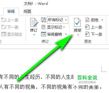 鼠标移到菜单栏这里,点击:审阅;下面展开相关内容。再点:接受