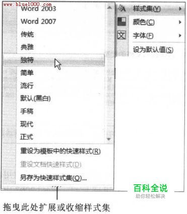 我们也可以通过"样式"组来访问"样式集”。如果单击"更改样式"工具,就会看到一些新功能,如图9 .3所示。选项组有"默认(黑白)"、" 独特"等选项,这些都是为方便用户能快速地改变文档外观而精心构建的样式集合(本章后续章节将详述这些样式集的出处)。 图9 .3 样式集提供了其他的同等样式,可使文档有不同的外观