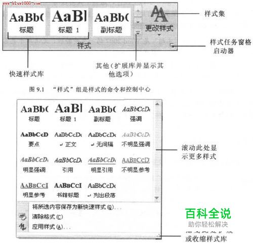 "开始"功能区中最明显的应用样式和更改样式的功能区控件是"样式"组。"样式"组表面上看起来简单,但它只不过是冰山一角罢了。如图9.1 所示,该组有4 个控件:"快速样式库"、"样式集"、"扩展库"以及"样式"任务窗格启动器。