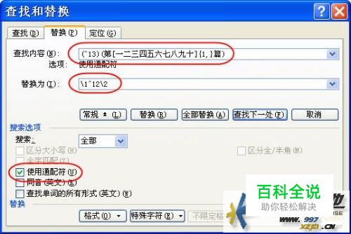 执行“编辑”→“替换”,打开“查找和替换”对话框,在里面进行设置,如图2。 说明: 在“查找内容”框中输入“(^13)(第[一二三四五六七八九十]{1,}篇)”,其中“()”用于分组,此处查找内容被分为两组;与^p一样,“^13”也代表段落标记,但在图2中“使用通配符”复选项被选中时,^p在“查找内容”框中不能使用,只能用“^13”。当首篇文章位于文档开头时,在此添加一个“^13”便可避免在首篇文章前添加分栏符(如果第一篇文章前还有前言,则另当别论);“[一二三四五六七八九十]”表示方括号中的任一字符;“{1,}”表示至少出现1个前一字符,此例中也可以使用“{1,5}”。 在“替换为”框中输入“1^122”,其中“1”表示“查找内容”框中的第一项分组内容;“^12”代表分栏符;“2”表示“查找内容”框中的第二项分组内容。 因为上面的“()”、“[]”、“{}”是通配符,所以在对话框中必须勾选“使用通配符”复选项。