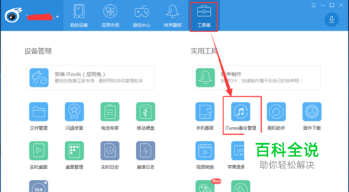 打开iTools软件,点击打开工具箱中的iTunes备份管理。