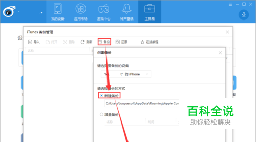 点击iTunes备份管理窗口上方的备份(或创建备份),再选中新建备份后点击确定按钮等待备份完成。备份需要一定时间 ,耐心等待!