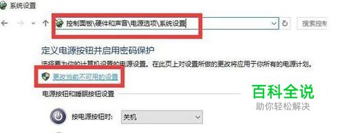 从打开的“控制面板”界面中,依次进入“硬件和声音”-“更改电源按钮的功能”界面,点击“更改当前不可用的设置”按钮。