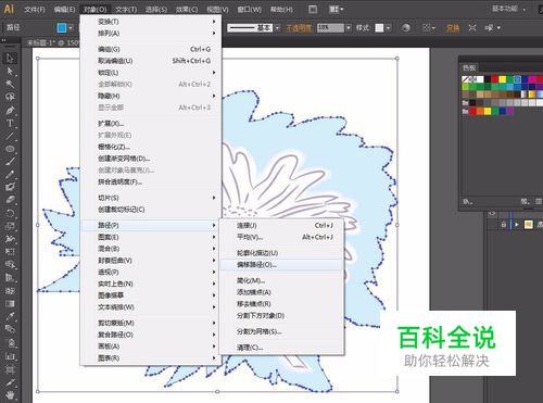 保持最大的青色背景轮廓是选中状态 执行【对象】菜单——路径——偏移路径 弹出【偏移路径】窗口: 勾选【预览】 位移:30px 确定 填充:白色