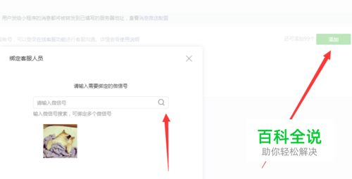 点击添加,在弹出来的搜索框里面输入需要添加的客服人员的微信号