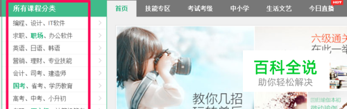 百度传课网可以让我们学习各种职业技能和专业知识,首先我们进入百度传课网首页,在左侧我们可以看到所有课程分类。