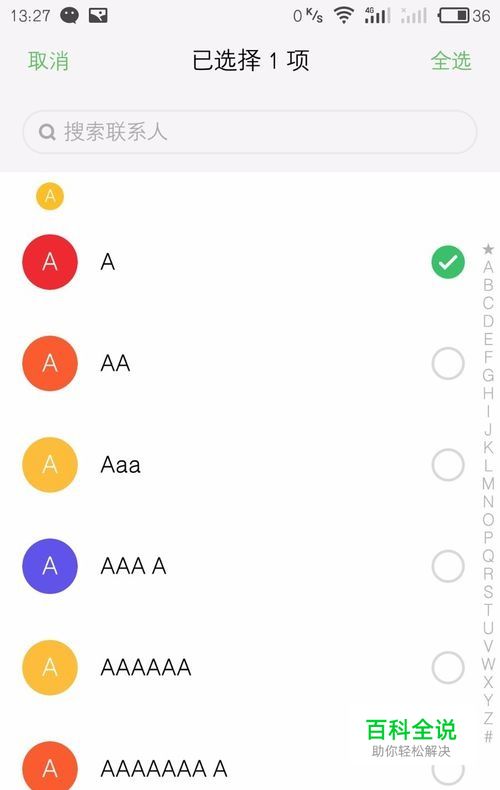 不同的手机牌子不能直接输入相关账号直接进行联系人的复制拷贝,因此需要通过手机分享功能进行联系人的转移。首先,打开旧手机的联系人列表随机选中一个联系人长按进入选择界面。