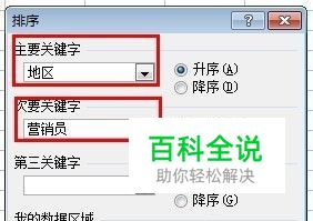 主关键字选择“地区”,次关键字选择“营销员”,其他选项默认。
