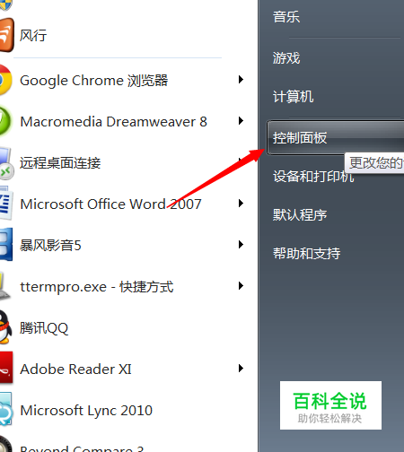 单击电脑左下角的开始菜单,选择控制面板