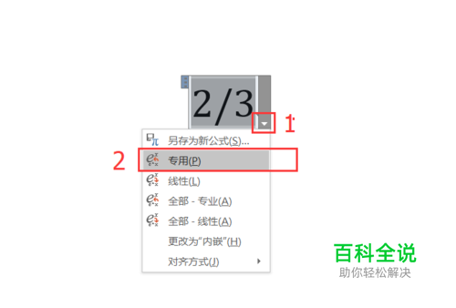 首先打开插入-插入新公式,然后出现一个公式编辑栏,在里面输入斜杠式的分式2/3,然后选择后面的箭头,再选择专业
