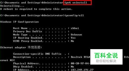那么我们卸载下ipv6协议看下,我们在命令行下输入uninstall ipv6即可,输入后需要重启生效;我们看下卸载成功后,ip地址就恢复到ipv4版本比较简洁。