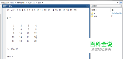 第二步:数组创建好后我们就可以进行数组或矩阵索引了,我们索引数组或矩阵时可以精确索引某行某列的元素,如我们在MATLAB命令窗口中输入代码: a(2,3) 即可精确索引出第2行第3列的元素,如下所示,索引结果为7。