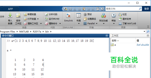 第一步:首先我们需要创建一个数组或矩阵,如我们在MATLAB命令窗口中输入代码: a=[1 2 3 4;5 6 7 8;9 10 11 12;13 14 15 16;17 18 19 20] 即可创建一个4行4列的数组,如下图所示。