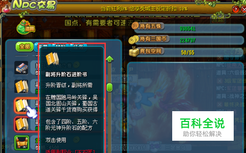 副将升阶石进阶书【6级】,制作四阶元神升阶石【6】、五阶元神升阶石【7】、六阶元神升阶石【8】,在【魏国跑马岭关驿】、【吴国北固山关驿】以及【蜀国古道关驿】等地的千货商处可购买,费用为40W三国币。