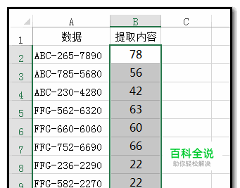 按下ENTER键,得出结果78 双击A2单元格填充柄,向下填充公式,得出相应的结果。 =MID(A2,FIND("/",SUBSTITUTE(A2,"-","/",2))+1,2)思路是: 1,用SUBSTITUTE函数把第二个“-”替换成“/”,这样方便接下来FIND函数 的查找; 2,再用FIND函数找出“/”的所在位置;再加1位,那么就是要提取的两位数字 的第一位。 3,用MID函数截取。