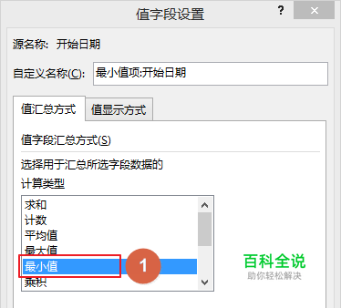 重点来了,要设置值的显示格式。 1、点“行”里面“开始日期”右面的三角箭头,然后选中弹出列表里面的“值字段设置” 2、在字段设置窗口,“值汇总方式”选择“最小值”,然后点击左下角的"数字格式" 3、在数字格式设置窗口,选则“日期”格式。 4、观察效果 5、再设置“结束日期”的“值汇总方式”为“最大值”,显示格式为"日期"。