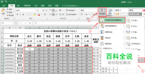 对优秀成绩(≥80)的成绩筛选方法与上述方法相似,只需将“小于60”的条件改为“大于等于80”,将字体颜色设置为“蓝色”,其它步骤不变。
