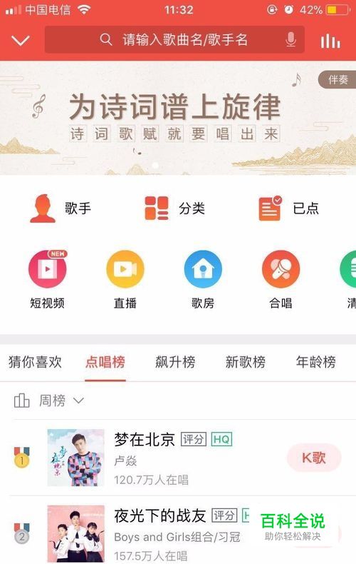 这是就会弹出相关的所有歌曲,在里面找出你想要唱的版本,然后直接点击K歌选项或者点击歌曲之后再点击我要K歌选项就会进入K歌界面。