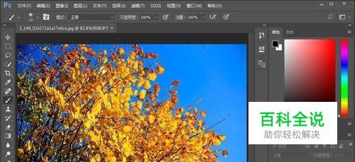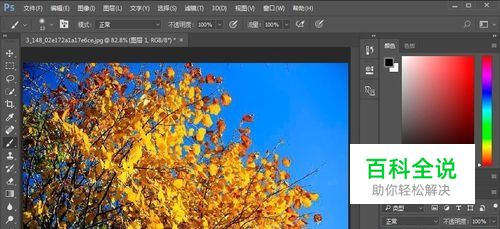 打开ps软件,然后导入一张树叶的图片,这也选用了一张蓝天背景,黄树叶的素材,如图所示: