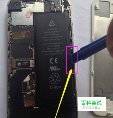 取出电池插座口的螺丝后,使用螺丝刀(撬棒)等工具,将电池接口撬开分离。 再将旧电池撬开,即可取下旧电池。