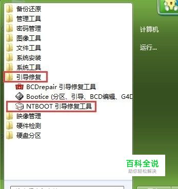 进入大番薯win8pe桌面后,单击开始菜单,找到“引导修复→NTBOOT引导修复工具”,单击打开,如图所示: